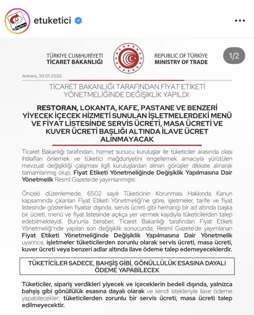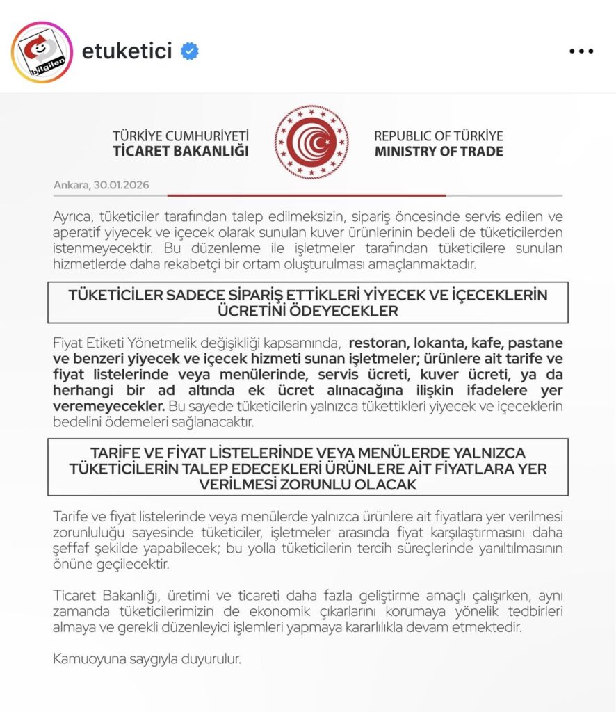 KUVER, SERVİS VE MASA ÜCRETİ GİBİ ADLARLA TÜKETİCİLERDEN BEDEL ALINMASI YASAKLANMIŞTIR!
